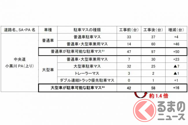 これにより上り線は、大型車駐車可能台数が42台から58台に、普通車駐車可能台数は47台から97台に増加。下り線も、大型車駐車可能台数が49台から66台に、普通車駐車可能台数は39台から120台に増えます(いずれも兼用マス分を含む)。