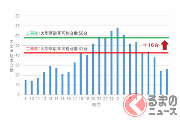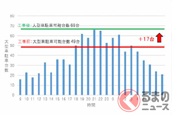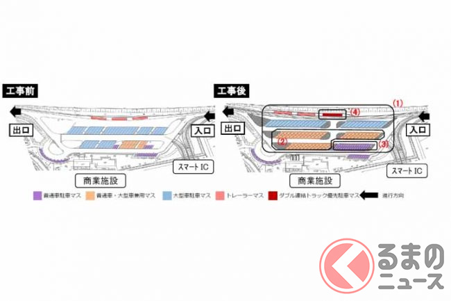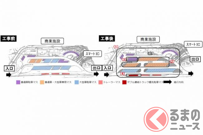 駐車場のレイアウトを見直したほか、普通車も大型車も利用できる「普通車・大型車兼用マス」を増設するなどして、大型車駐車可能台数は上下線合わせて約4割(+33台)増えます。