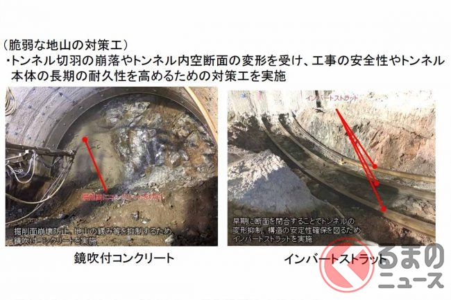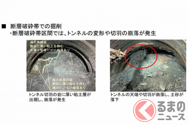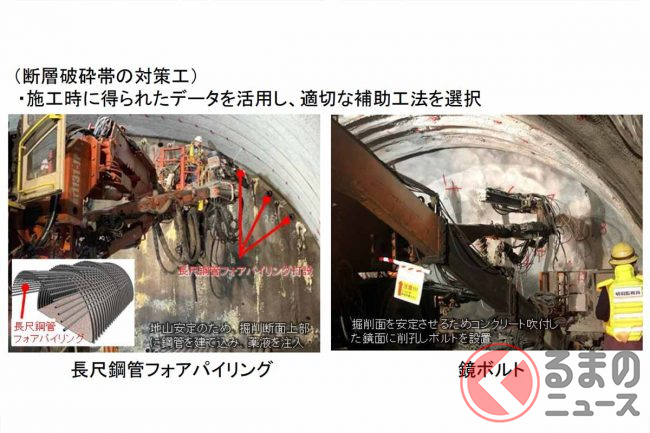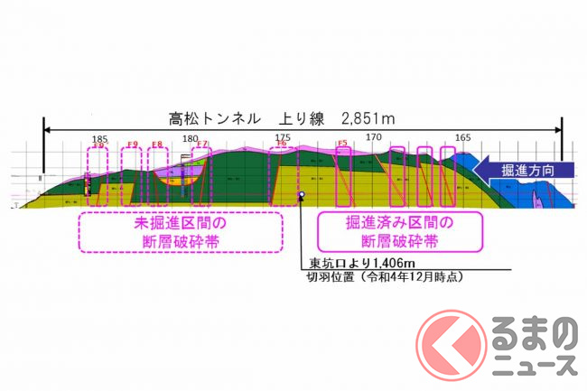 このトンネルには、水に触れると崩壊・膨張する性質を持つ緑色凝灰岩が点在するなど脆弱な地山が出現。さらにトンネルの変形や切羽崩落を引き起こす断層破砕帯も確認されているといいます。