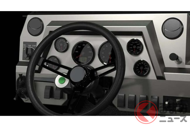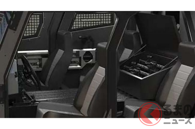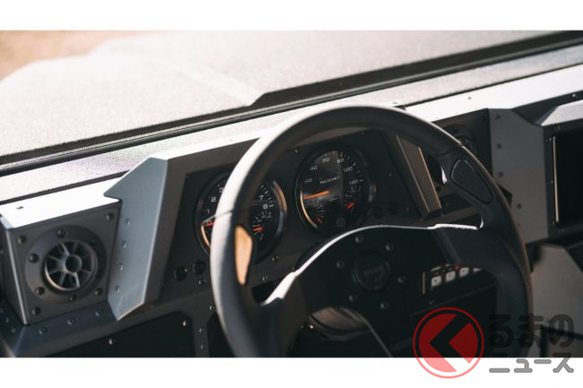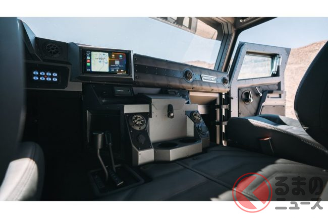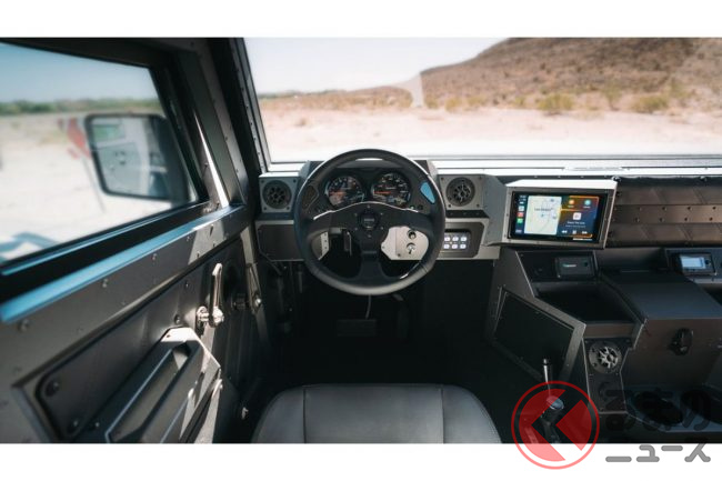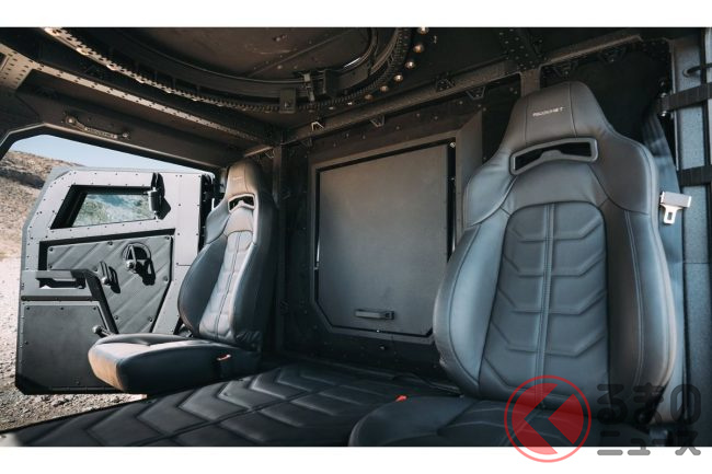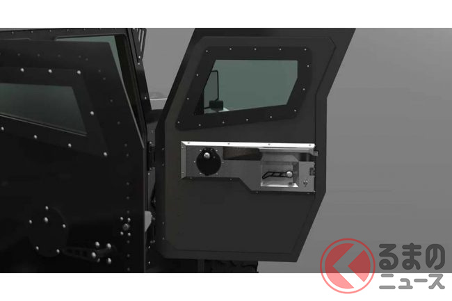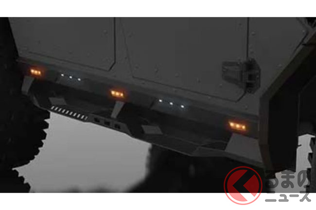 エクステリアでは、大きな丸形ヘッドライトや、大型のブルバーを装備し、異様な雰囲気を放っているほか、ビス止めのボディパネルや物々しいウインドウ、3つずつ用意された頑丈そうなドアヒンジなどがいかにも装甲車といった印象を与えています。