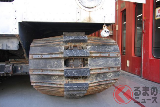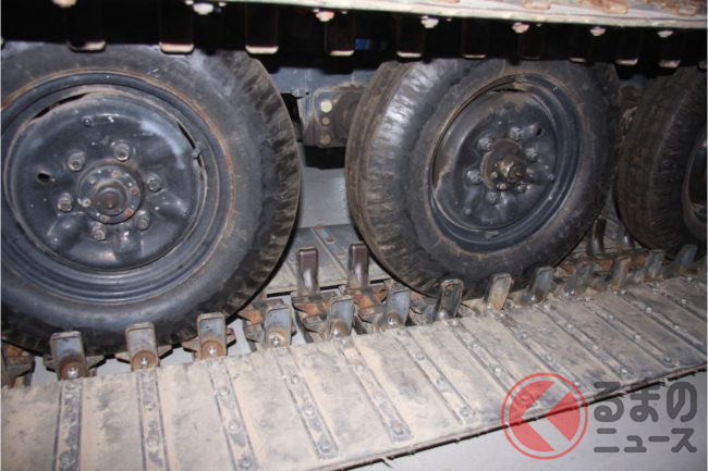 戦車や装甲車と同じ装軌車(いわゆるキャタピラ車)なのですが、足回りの構造はかなり違います。