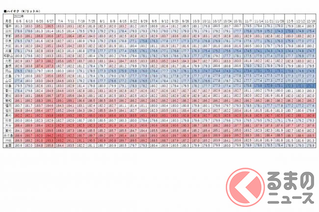 資源エネルギー庁は2022年12月21日、レギュラーガソリンの19日時点の店頭小売価格(消費税込)を発表しました。