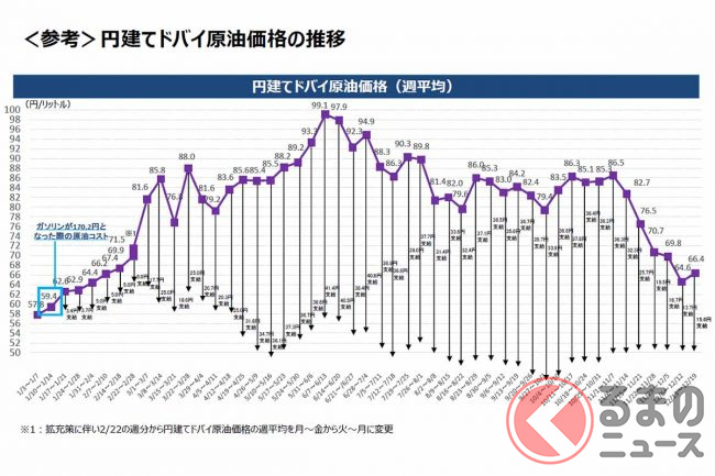 ガソリン価格の高騰を受け、政府は石油元売り企業に補助金を出す価格抑制策を実施。ガソリン、軽油、灯油、重油を対象に2022年1月27日から1リットルあたり5円、3月10日から25円、4月26日から35円を上限に支給しており、さらにそれでもガソリン1リットルの平均価格が170円(4月25日の週からは168円程度)を超過したら、その半分を支援すると発表しています。