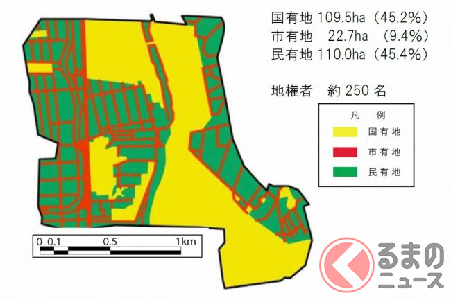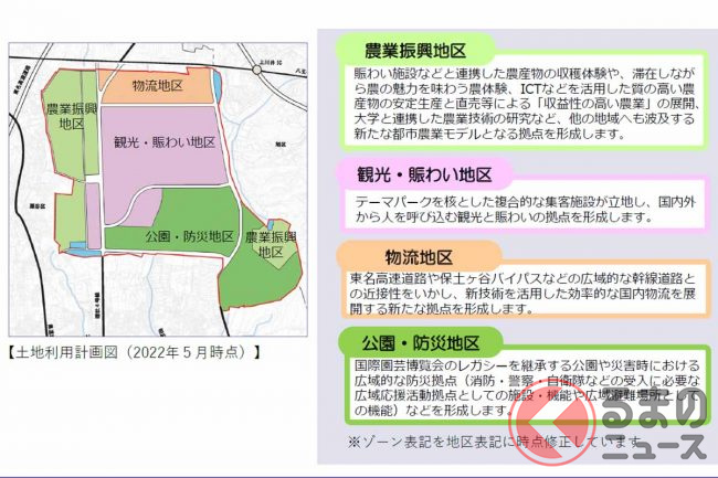 2020年3月に策定された跡地の土地利用基本計画では、テーマパークを核とした「観光・賑わい地区」の周りに「農業振興地区」「物流地区」「公園・防災地区」を配置する構想を掲げています。