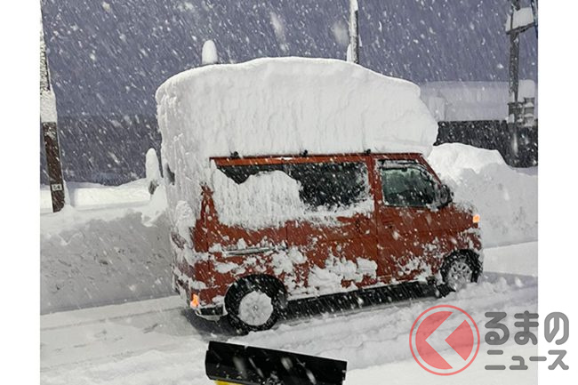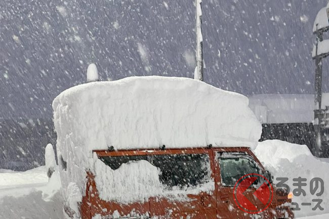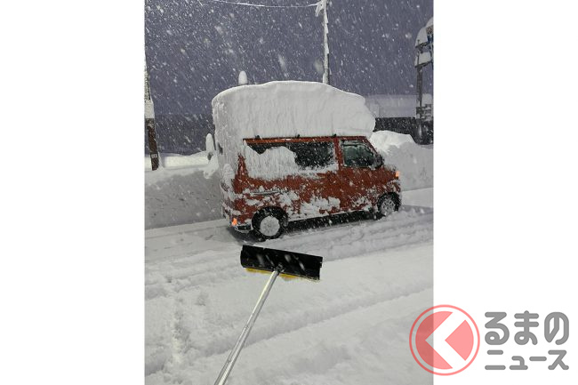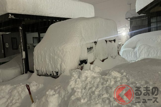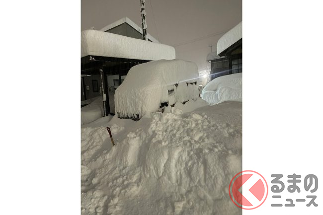 写真を見ると、クルマの屋根には何十センチもの雪が積もっており、まるでクルマもう1台分が載っているかのようにも見えます。記録的な大雪が降ったことを物語る光景といえます。
