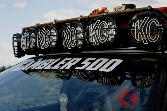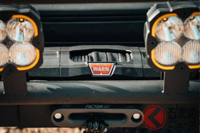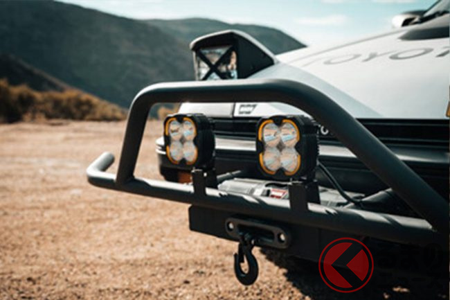 またルーフには積載性の高いキャリアが装着され、そこには「KC HiLiTES」のオフロードライトを6個設置。デザイン性の高さとともに明かりのない夜間走行での活躍が想像できます。