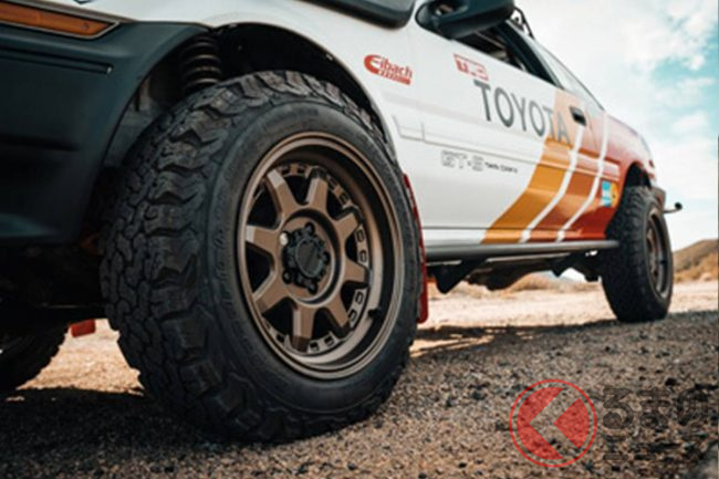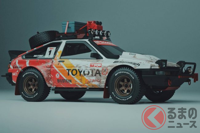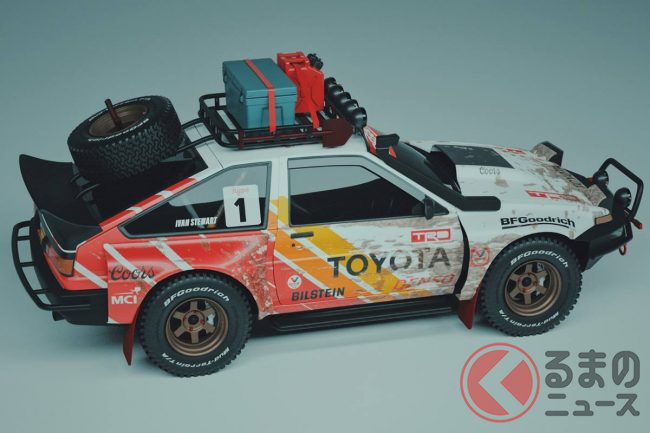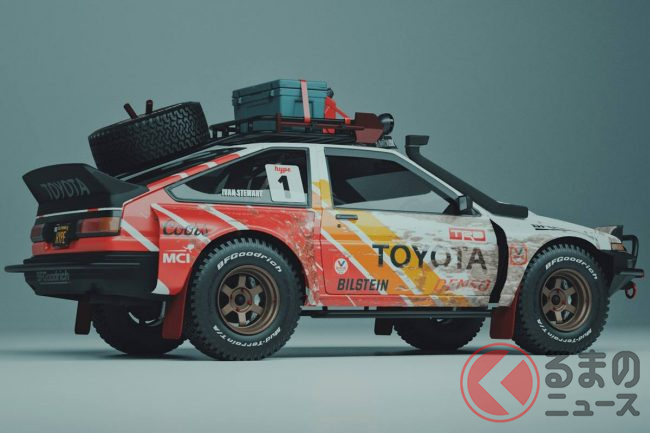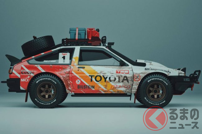 そのイメージCGのAE86は、リフトアップされたボディに巨大なオフロードタイヤを履かせた迫力の溢れるスタイルを持っており、ルーフに搭載したキャリアやホイールからもタフさを漂わせる、とにかく純粋に「カッコいい!」と思わせるものだったといいます。