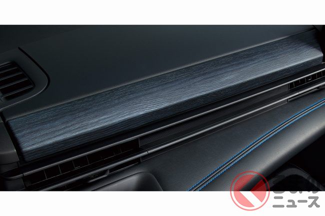 インテリアでは、シートに柔らかいレザレットという素材を採用したほか、波の動きをモチーフにした模様を施しています。インパネには、光の加減でブルーに光るダークグレーの木目調パネルを取り入れました。