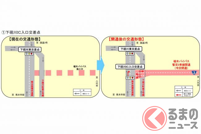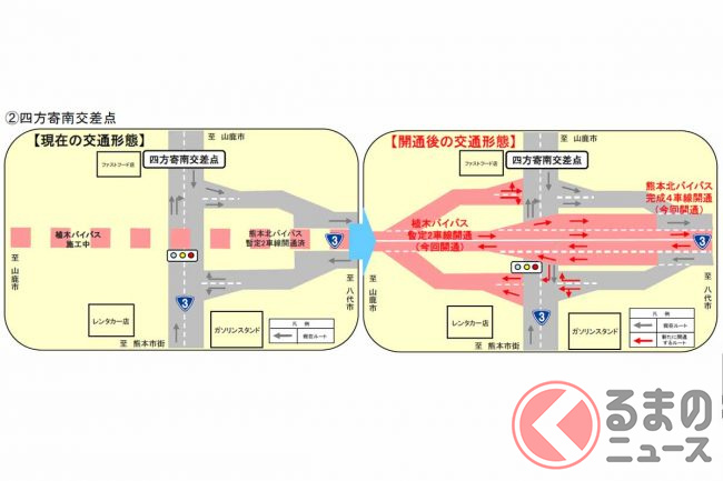 これにより、植木バイパスと熊本北バイパスが熊本都市圏の環状道路網に組み込まれ、熊本市内の混雑緩和や安全性向上につながるといいます。