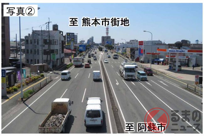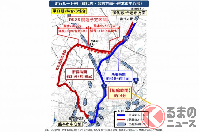 国土交通省九州地方整備局熊本河川国道事務所によると、今回の開通により、例えば平日朝7時台に御代志駅(熊本県合志市)から熊本市役所(熊本市中央区)にクルマで向かう場合、国道3号(現道)経由だと約11km・約45分ですが、開通区間や熊本西環状道路軽油だと道のりは約16kmと遠回りになるものの所要時間は14分ほど短縮され約31分になるといいます。