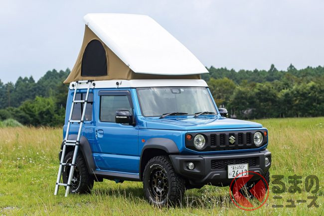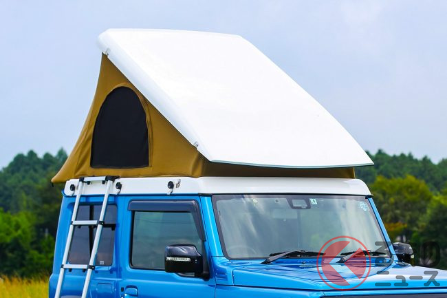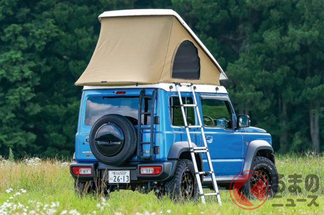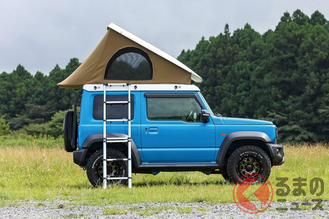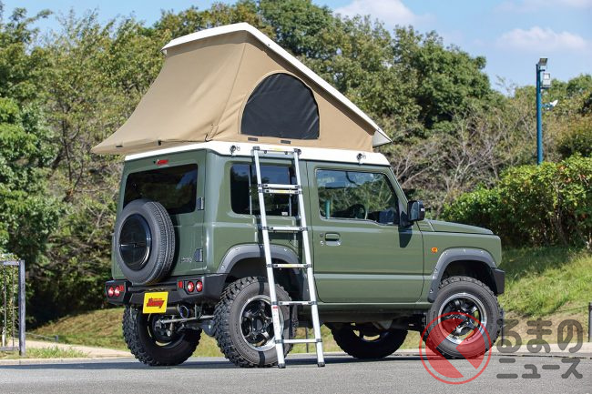 スズキ「ジムニーハイルーフ」登場? 車中泊ならぬ「車上泊」出来る! 屋根跳ね上がる77万円テントが凄かった!