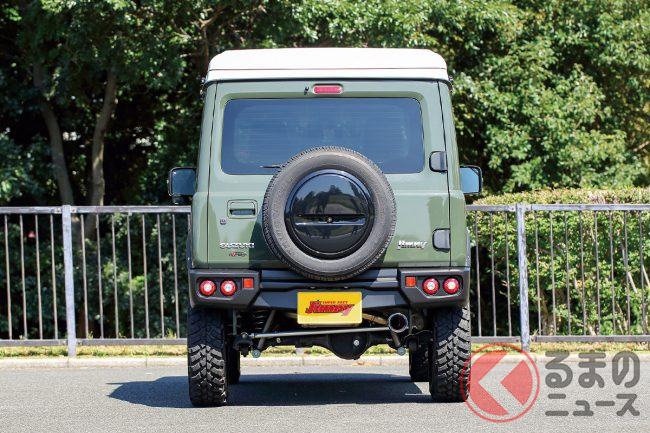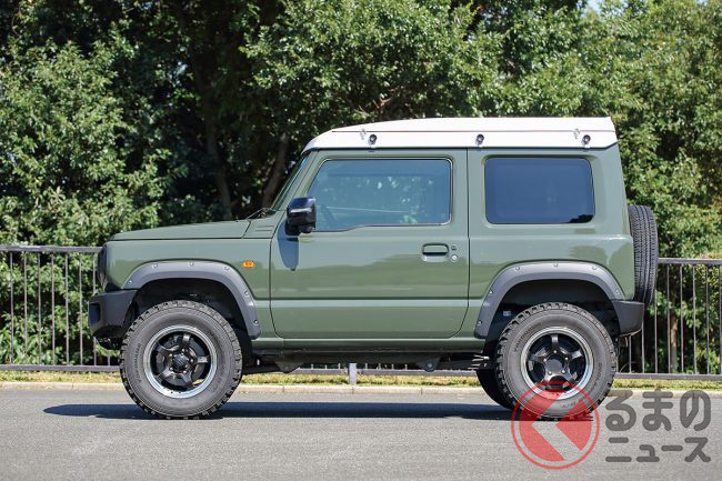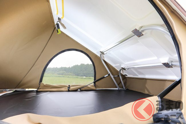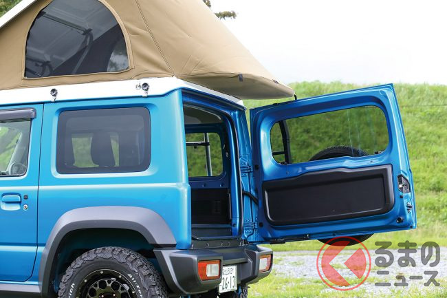なお、通常のジムニーのルーフは前後長が短く、そのままでは就寝時に長さが足りないため、後端部を折りたたみ式に設計。展開すれば身長180cmの人でも足を伸ばして就寝が可能だとされています。