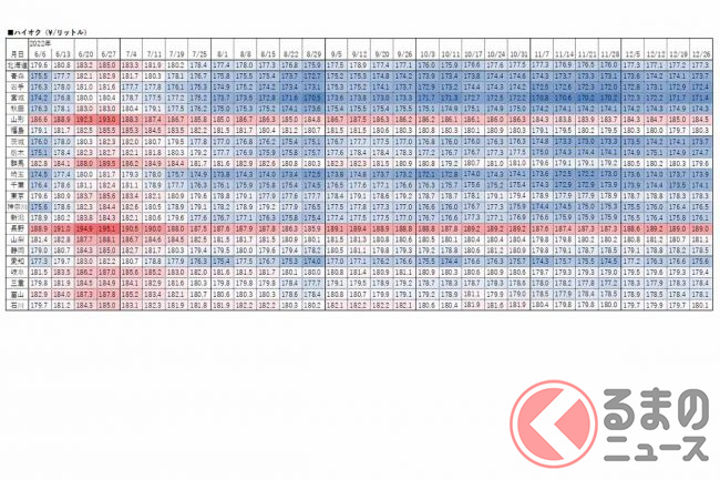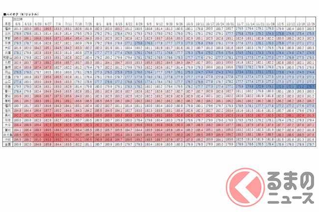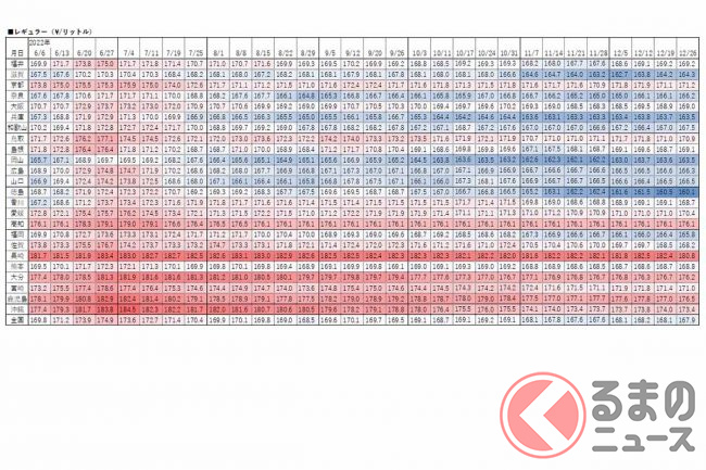 資源エネルギー庁は2022年12月28日、レギュラーガソリンの26日時点の店頭小売価格(消費税込)を発表しました。