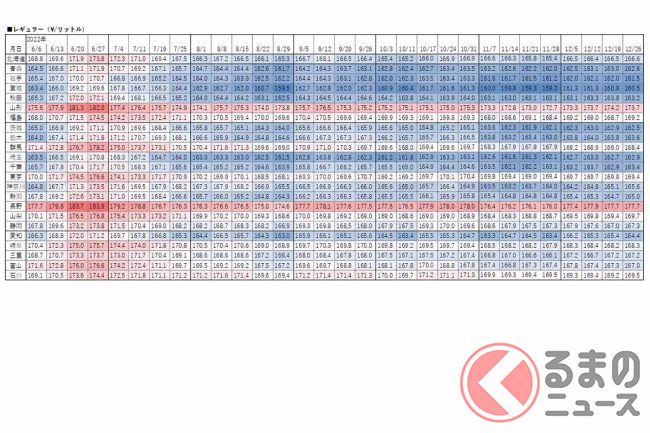 一方、最も高かったのは長崎県で180.8円、次いで長野県177.7円、鹿児島県176.5円でした。