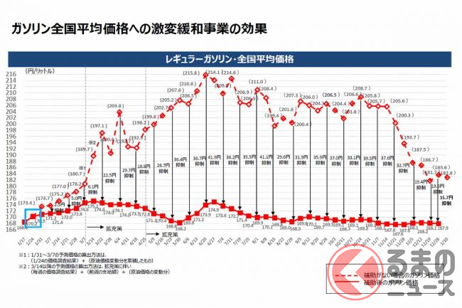 なお、経産省によると、補助金がない場合のレギュラーガソリンの全国平均小売価格は、12月26日時点で1リットル183.6円と算出しており、次回調査日の2023年1月10日の時点で182.8円に下がると見ています。