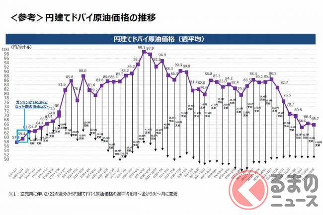 ガソリン価格の高騰を受け、政府は石油元売り企業に補助金を出す価格抑制策を実施。ガソリン、軽油、灯油、重油を対象に2022年1月27日から1リットルあたり5円、3月10日から25円、4月26日から35円を上限に支給しており、さらにそれでもガソリン1リットルの平均価格が170円(4月25日の週からは168円程度)を超過したら、その半分を支援すると発表しています。
