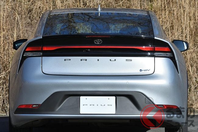 トヨタ新型「プリウス」新たなバッジをお尻に装着!「ハイブリッドの再生」青丸とHEVが意味することとは?