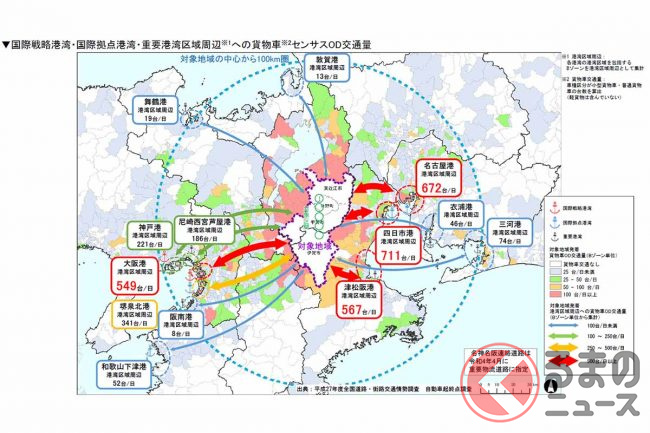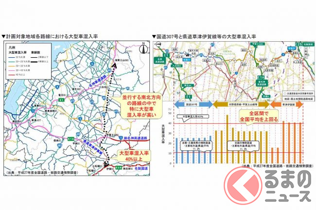 名神名阪連絡道路の想定ルートと並行する国道307号などは、現状では大型車比率が全国平均を上回っており、40%を超える区間も存在。通過する物流交通と地元の生活交通が混在しているといいます。