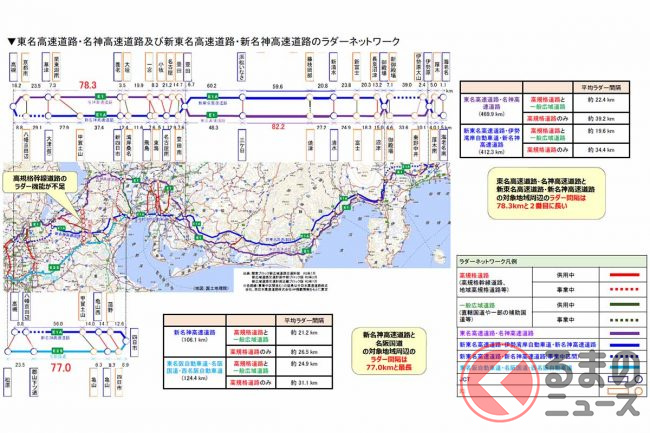 首都圏・中京圏・近畿圏を東西に結ぶ高速道路は東名・新東名・名神・新名神がありますが、これらの路線を南北につなぐ主要道路の間隔は、平均約21km(事業中路線含む)であるのに対し、検討地域は鈴鹿山脈が横たわっていることもあり78.3kmと長い状況となっています。