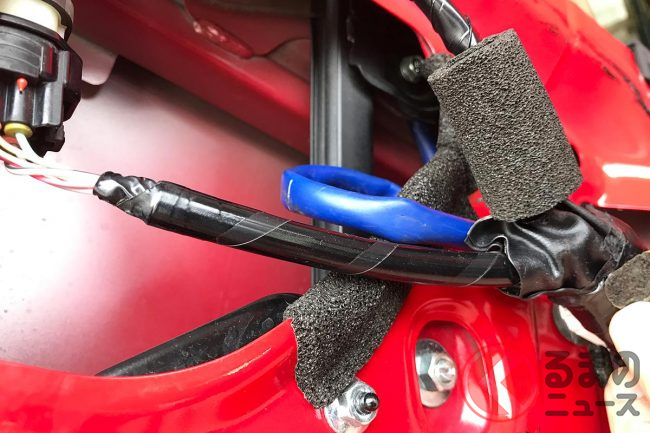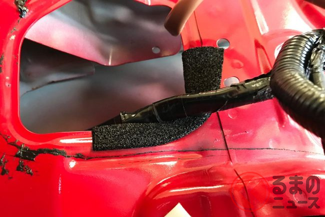 T整備士が懸念しているのは、伸びた配線を開閉時にドアで挟んでしまい、ハーネスを傷めてしまったり、フェンダーまで変形してしまう恐れがあるということです。