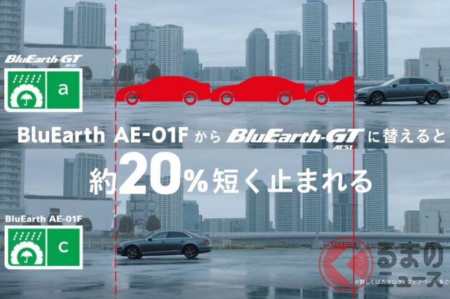 今回のCMテーマは、“ウェットグリップ性能「c」のBluEarth AE-01Fからウェットグリップ性能「a」のBluEarth-GT AE51に替えたら「約20%短く止まれる!」”とのことです。