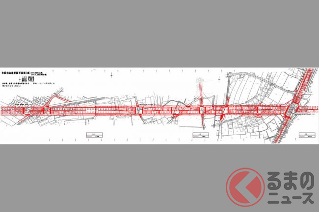 道路は6車線(片側3車線)、設計速度50km/h、標準幅員36mの大通りで整備されます。