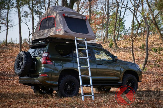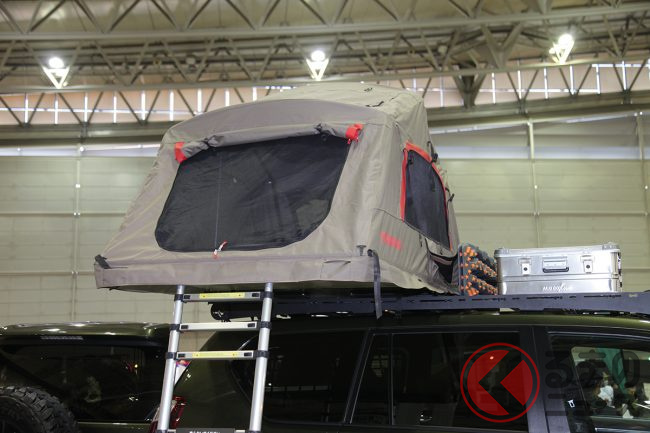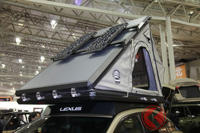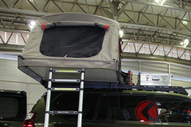 ボディカラーは専用の「レゴリス」となっているほか、アルミスキッドプレート、専用耐チップブラック塗装のバンパー類などを装備し、ルーフにはアルミ製ラックとルーフトップテントが積載されています。