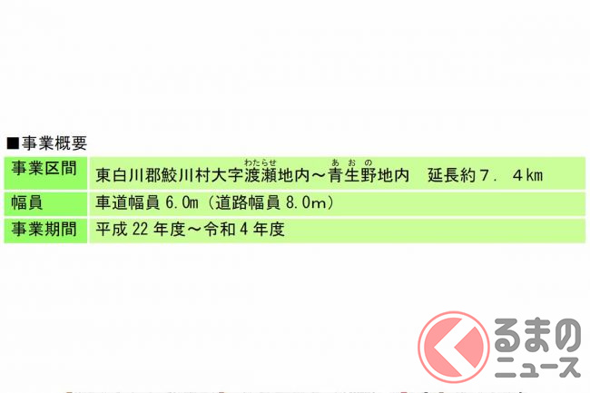 福島県土木部は、バイパス整備により車道幅員は6mが確保され、線形も緩やかになるため、安全性や走行性が向上。広域的な連携・交流や通行確保が図られるものと期待されるとしています。