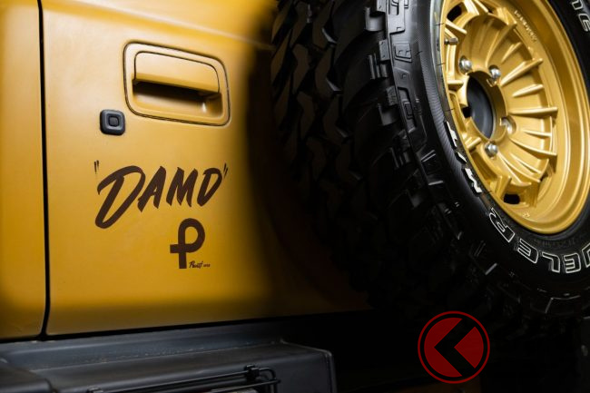 「このlittle G. TRADITIONALは、初代Gクラスをオマージュして作った、僕らが本当に好きなダムドらしいクルマです。ただのオマージュではなく角目フォグの導入やナンバープレートをオフセットさせることで、ジムニーに今までにはなかったパーツとしてジムニーファンに受け入れられるように作ったボディキットです」