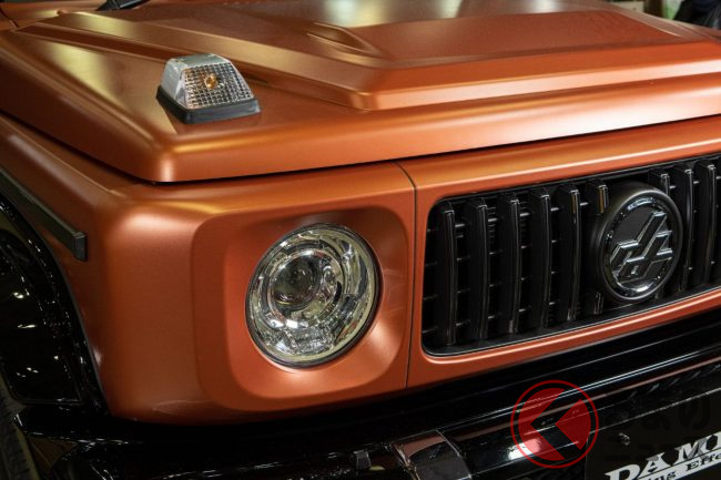 サイドでは、純正部品と比較してシャープな印象のオーバーフェンダーや、サイドステップ、トラックのような大型のミラーなどが取り付けられ、「ゲレンデヴァーゲン」と呼ばれた時代の初期モデル(W460型)や、プロフェッショナル向けのW461型を思わせる無骨でレトロな印象をもたせています。