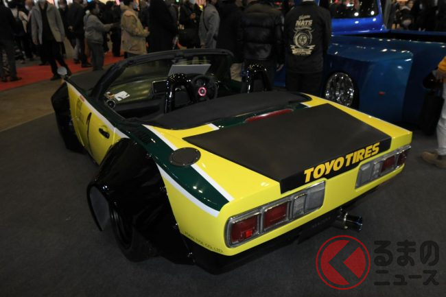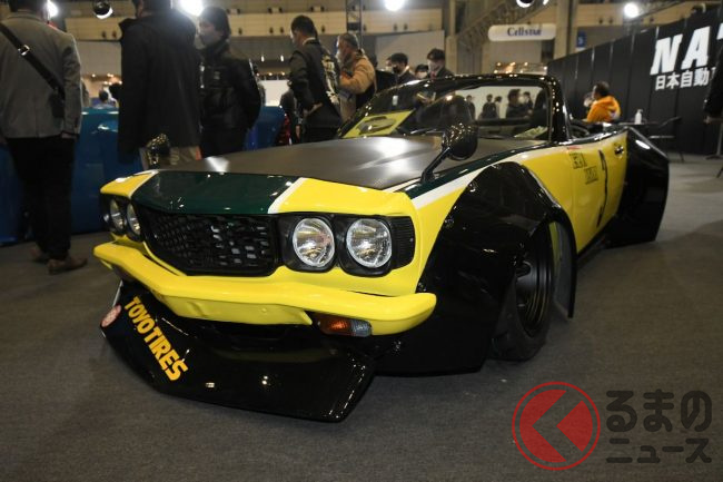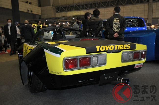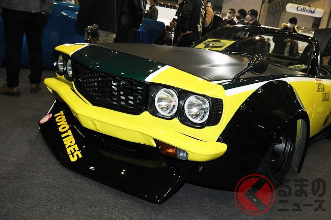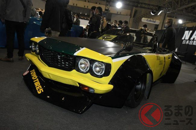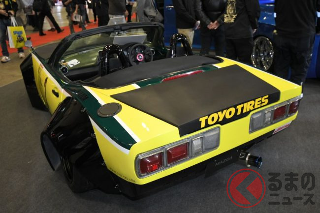 その見た目は、サバンナGT(輸入名:RX-3)をオマージュしたような丸目4灯かつメッシュグリルを装着するほか、インパクトのあるイエロー&グリーンのボディカラーが目を引きます。