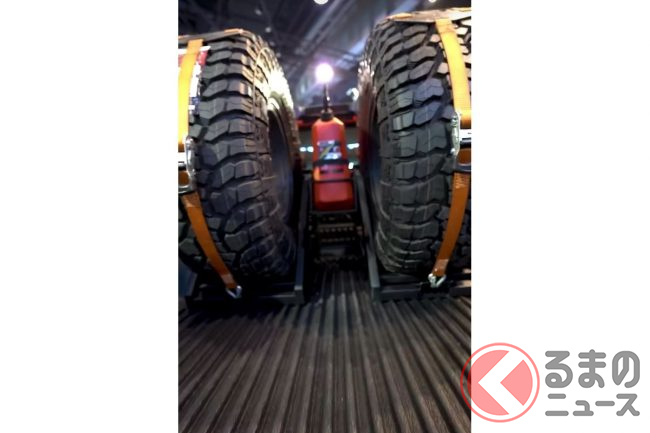 足元には大柄なオフロードタイヤが組み付けられていますが、オーバーフェンダーを大きく飛び出しているため、日本での車検取得は困難であることが推察されます。