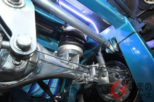足回りにエアフォースのエアサスを取り付けましたが、専用設計のポン付けではないのでマウントやリンクを考えながら作るのに苦労しました」