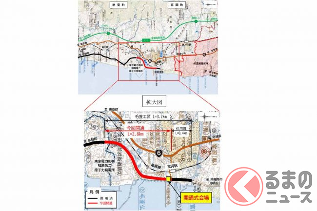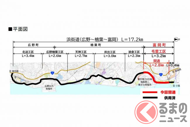 このうち広野町から楢葉町を経て富岡町に至る約17.2kmの区間は、1997年度に事業着手。2011年の東日本大震災では津波や原発事故により甚大な被害を受けましたが、被災地域の復興道路として整備が進み、すでに14.4kmが供用されています。
