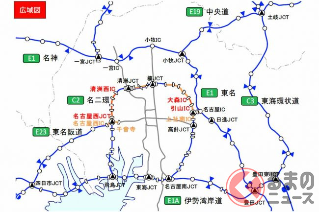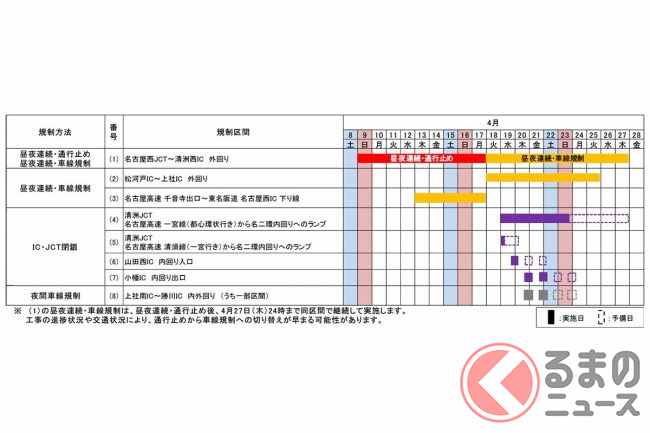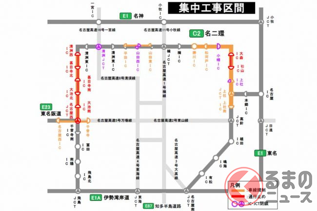 NEXCO中日本は2023年1月18日、名二環(名古屋第二環状道)で4月と5月に集中工事を実施すると発表しました。連続10日間の昼夜連続通行止めなどが計画されています。