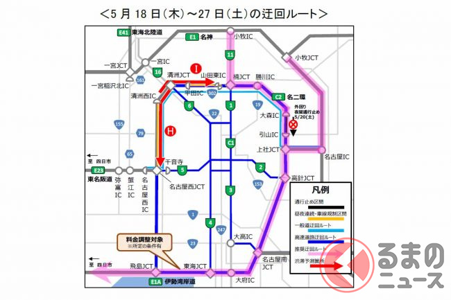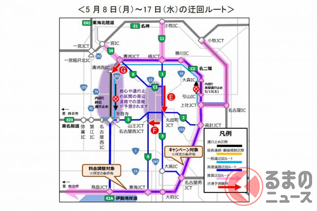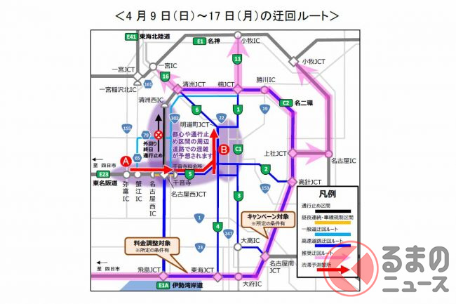 NEXCO中日本名古屋支社は、伊勢湾岸道への広域迂回や、朝・夕の混雑時間帯を避けた利用、公共交通機関の利用を呼び掛けています。また、迂回時の料金調整やキャンペーンも実施する予定です。