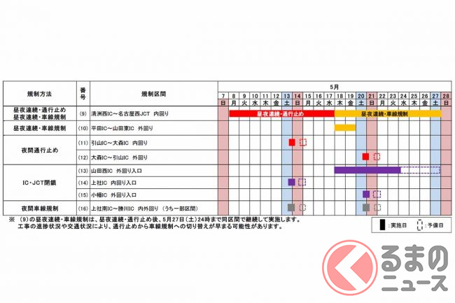 また、引山IC~大森IC間も、内回りが5月13日22時から翌5時まで、外回りが5月20日22時から翌5時まで、それぞれ通行止めです。