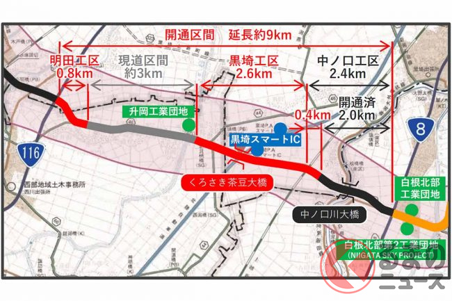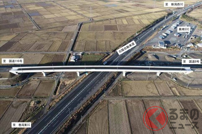 途中、北陸道をまたぐ「くろさき茶豆大橋」も開通。あわせて黒埼スマートICとも接続し、県内の重要幹線道路である国道8号、北陸道、国道116号、県道2号新潟寺泊線と連絡します。