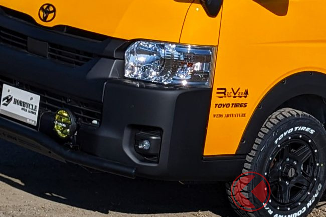 ジャパンキャンピングカーショー2023に展示予定の新型ホビクルWは、オレンジ色の外装にバンパーやフェンダーアーチがブラックにまとめられ、さらにフロントにフォグランプを装備しているなど、SUVのようなタフなイメージを持たせています。