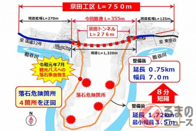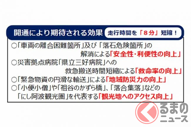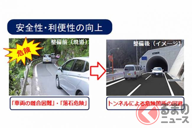 また、クルマ同士のすれ違い困難箇所や落石危険箇所も解消。救急搬送時間の短縮や観光スポットへのアクセス性向上なども期待されるということです。