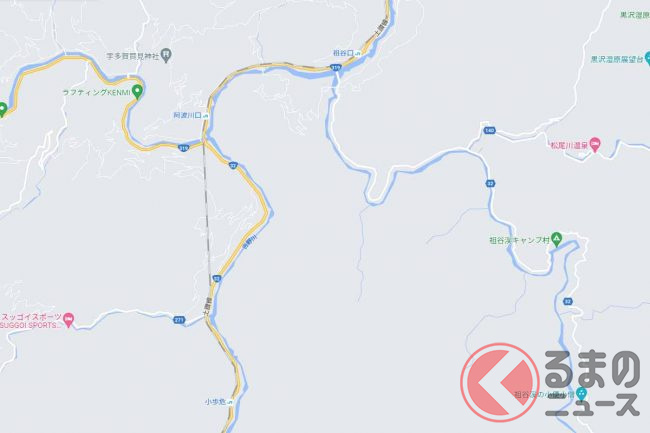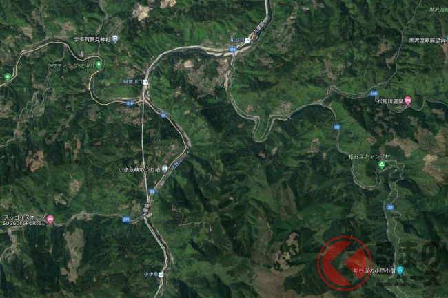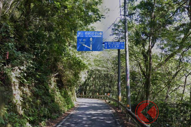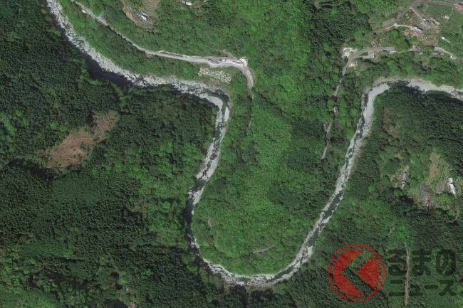 この区間は祖谷川の蛇行に合わせて道も大きく「ひ」の形のような遠回りのカーブを描いています。道幅は最小3.5mと狭く、4か所の落石危険箇所もあり、実際に2019年には観光バスへの落石事故が発生しています。