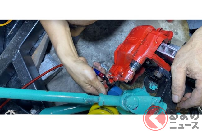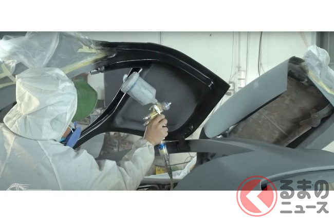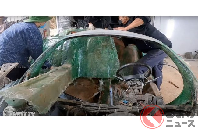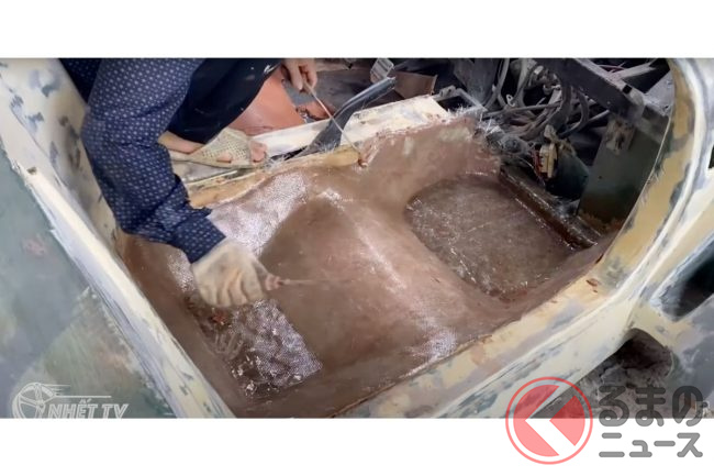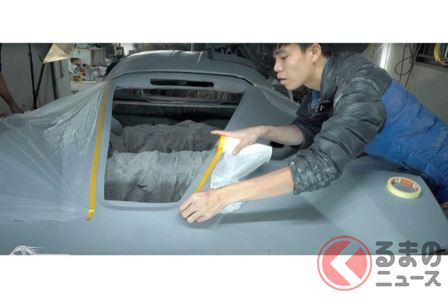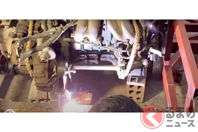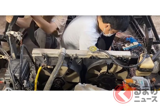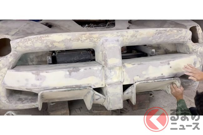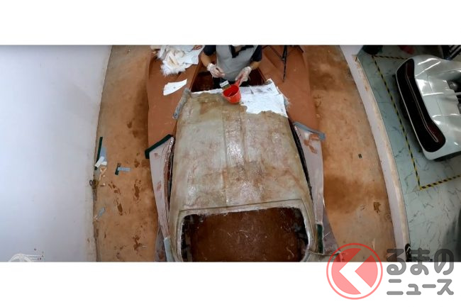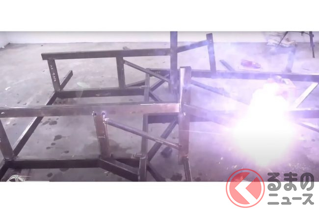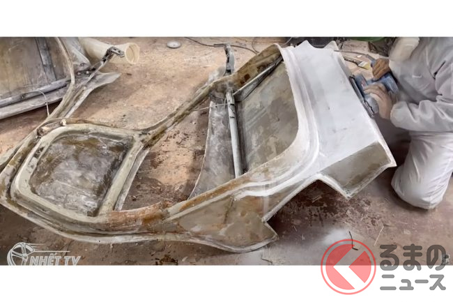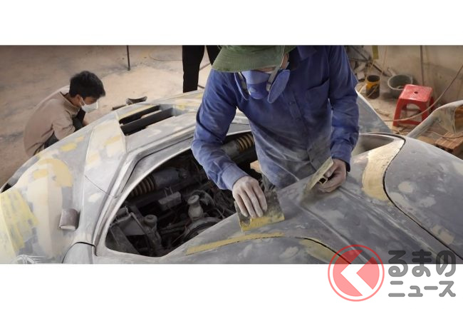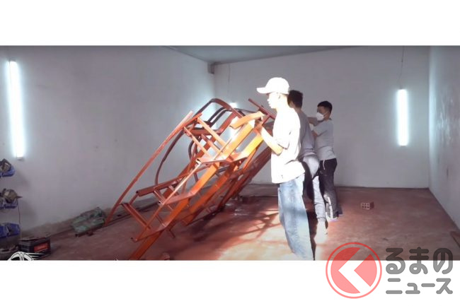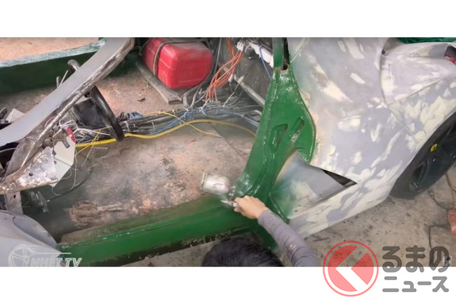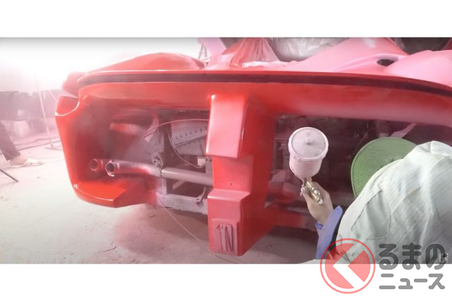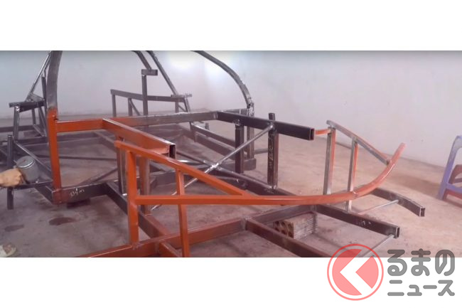 ドアやフェンダーパネルなどが取り外され、車種の判別すら難しい廃車寸前のトヨタ製セダンからエンジンや車軸などを移植。タイヤやサスペンションなどを取り付けていき、各所をキレイに塗装しながら、フレームのみで走行可能な状態にします。