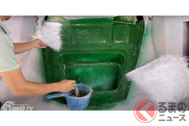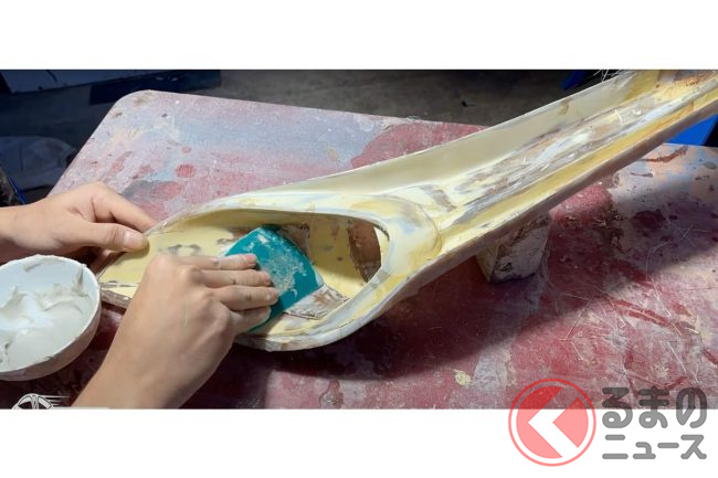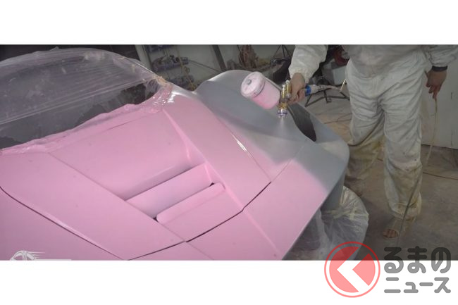 粘土の型のうえからFRPを貼っていくことでボディカウルを作成します。カウルも形成ができたら下地塗装をおこない、さらに、クルマのシャシーとなるフレームワークを金属製のパイプで組み上げます。