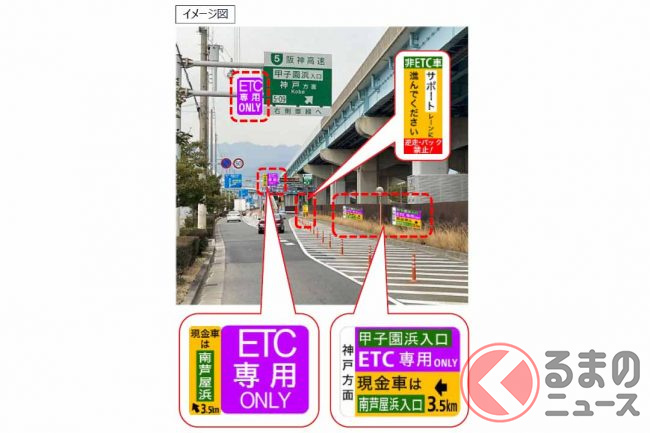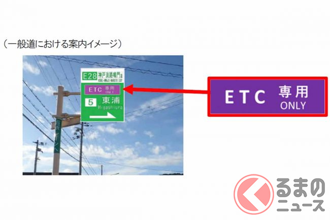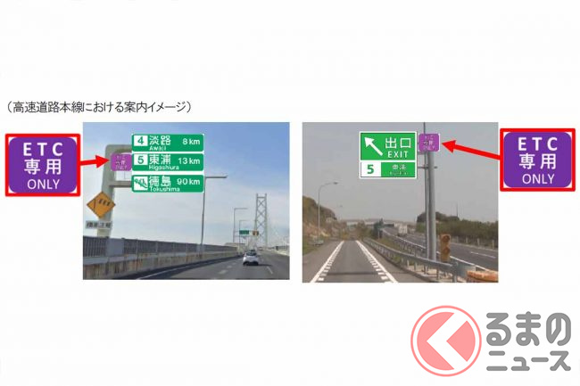 これらETC専用料金所のIC付近では、高速道路本線や一般道の標識にETC専用であることを示す標識板が追加される予定です。