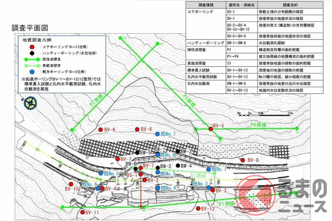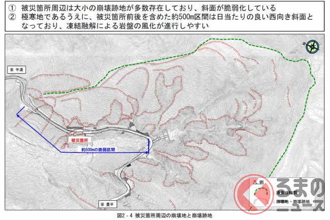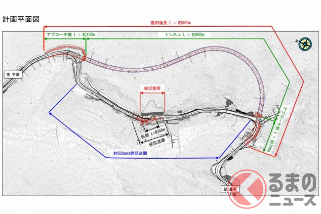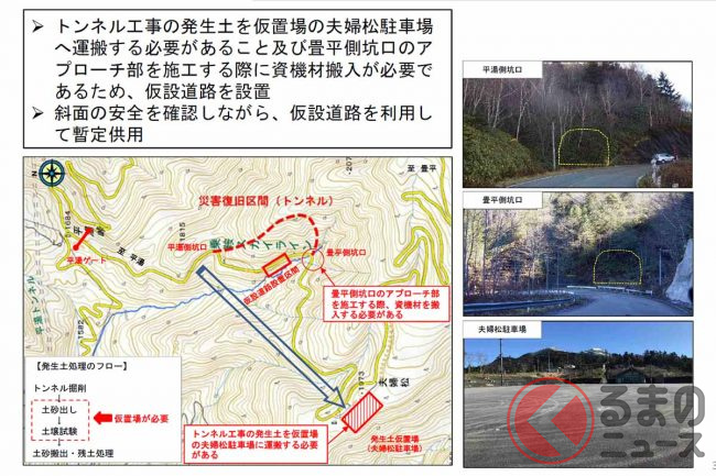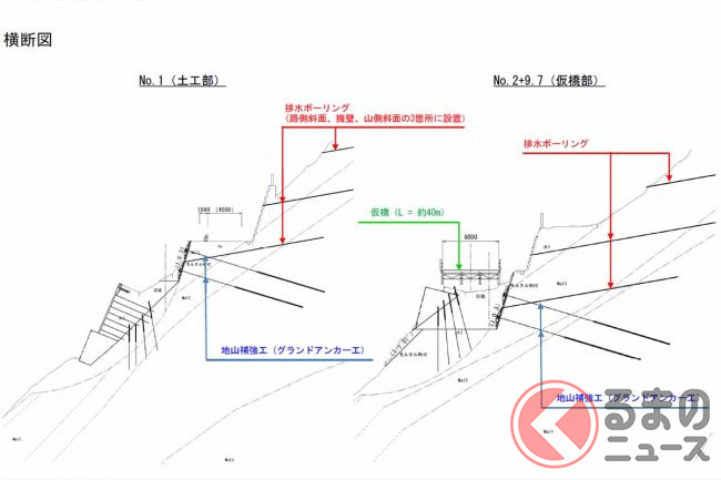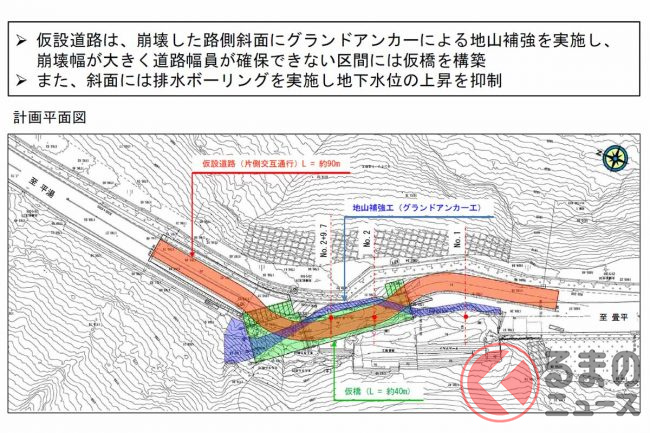トンネル工事に際しては仮設道路も設置されます。崩落箇所では地山補強や延長約40mの仮橋構築などにより片側交互通行可能な通り道を確保。斜面の安全を確認しながら、トンネルに先駆けて2024年中には暫定供用にこぎつける考えです。
