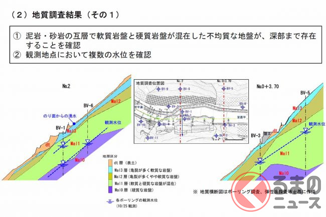 20日に岐阜大学で開かれた第3回会議では、崩落箇所周辺は複雑な地質構造を有しているうえ、地下水の影響を受けて風化が進んでおり、元ルートでの復旧は不適当といった報告を踏まえ、現場を迂回するトンネルの新設が決まりました。