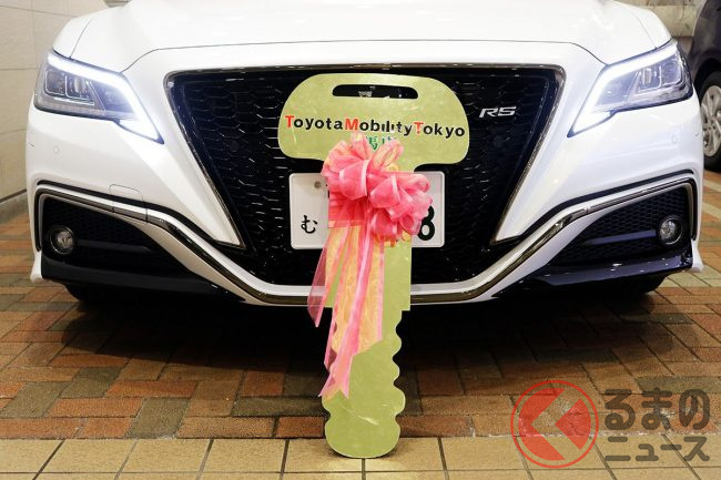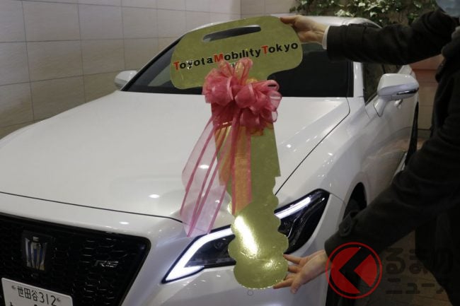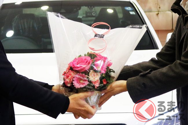具体的な内容は販売店ごとに異なりますが、主なものでは花束の贈呈のほか、カギの模型を持ってクルマと一緒に記念写真の撮影などが多く実施されており、最近ではカギの模型がスマートキーの大きなレプリカになっているところもあります。