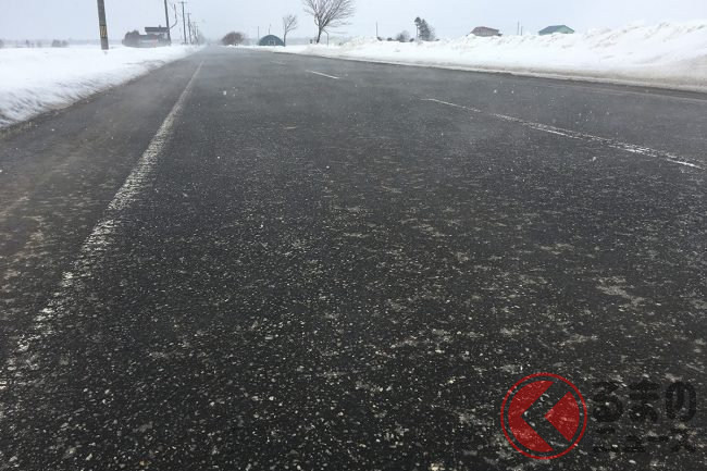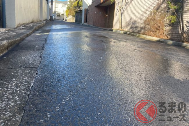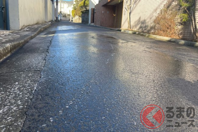 朝、凍ってても気づかずツルッと!? 特に要注意な「黒光り路面」とは ノーマルタイヤ走行で「反則金6000円」知ってた?