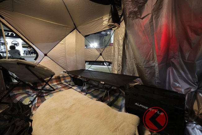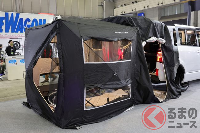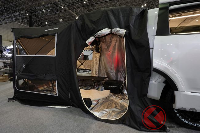 ちなみに東京オートサロン2023に出展されていた「プラスステイEX」という外付けテントは、ミニバン・SUVのカステムでお馴染みのアルパインスタイルがリリースしたもので、アルパインスタイルの広報スタッフは次のように語ります。