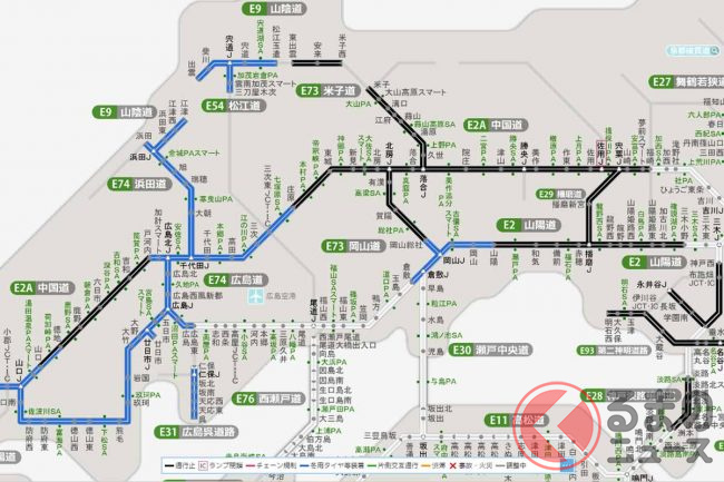 近畿から中国地方にかけては、山陽道が三木小野IC~山陽IC間で、中国道は福崎IC~庄原IC間や戸河内IC~徳地IC間などでそれぞれ通行止めとなっており、近畿・中国・九州を東西に結ぶ動脈が寸断しています。